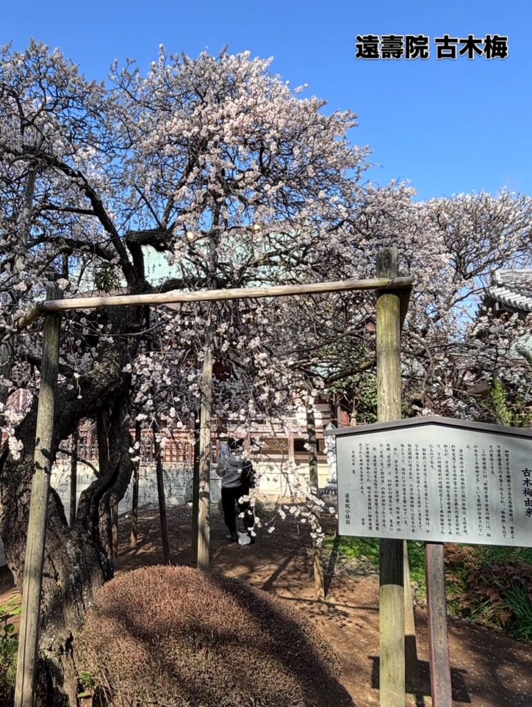 自転車をとめて境内を進んでいくと、遠寿院の古木梅が今年も見事に咲いていました。